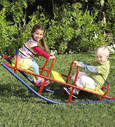 Rock on! As many as three children can have a rockin' good time aboard this great seesaw that combines two favorite children's rides-a good-old-fashioned teeter totter and a rocking chair-to create a little extra excitement and a lot more fun. Expertly crafted from durable weather-resistant metal with rubber-padded rockers, comfy seats and sturdy handlebars, it will provide years of exuberant riding fun indoors or out, on a soft surface. Adult assembly required. For ages 18 months to 8 years. Maximum weight is 140lbs total or 70lbs for each seat. Size:55-3/4"L x 19-1/2"W x 20-3/4"H.