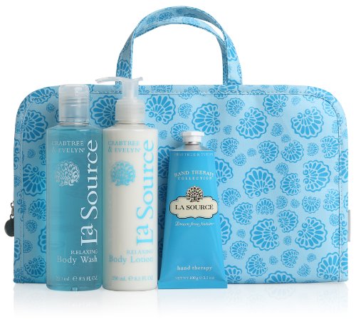 The three revitalising La Source luxuries in this pretty blue cosmetic tote are the absolute must-haves in the range. Each is made with marine botanicals, mineral salts and seaweed to nourish and nurture your skin. Contains: * La Source Relaxing Body Wash (250mL/8.45 fl oz) * La Source Relaxing Body Lotion (250mL/8.45 fl oz) * La Source Hand Therapy (100mL/3.4 fl oz) Fragrance: A crisp, clean scent reminiscent of fresh sea air