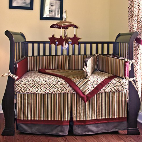 Hoohobbers Hot Tamale! 4 Piece Crib Bedding Set combines variegated stripes, polka dots and spicy solids in rich, warm hues of orange, chili red, chocolate brown, caramel tan and dulce de leche cream to create a strong and bold nursery for your baby boy. Ultra soft micro suede accents add to the warmth and cosiness of this bedding grouping. Made in the USA, the set includes 18Ó drop crib skirt, bumpers, double-sided blanket backed with double-knapped flannel and a fitted sheet. Machine washable.