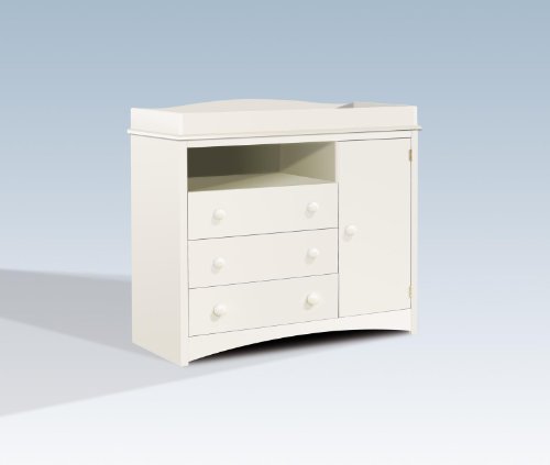 This elegant changing table with fresh clean lines, profiled edges, and stylized decorative kickplate will highlight your baby`s bedroom decor. It provides plenty of drawer storage space and has an adjustable shelf behind the door. Features: Fresh Pure White finish (matches other South Shore Pure White finish items) Wooden knobs Constructed of CARB compliant materials Plenty of drawer space Greater changing-area depth Decorative moulding Profiled edges on tops, drawer fronts, and kickplate 1 adjustable shelf behind door 3 drawers, 1 door, and 1 open storage space Innovative drawer Smart Glides with lifetime warranty Child-friendly safety catches on drawer glides Manufactured from engineered-wood products 5-year warranty Assembly required Specifications: Dimensions of the open shelf: 28 1/2 X 18 1/2 X 6 3/4 Dimensions behind the door are 14 X 7/8 X 18 1/2